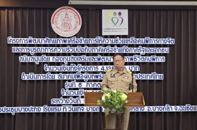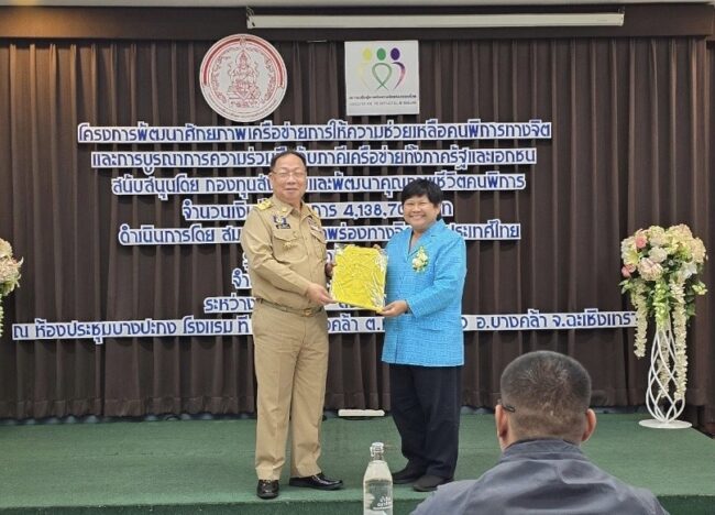 น.ส.ฐิติพร พริ้งเพลิด อุปนายกสมาคมเพื่อผู้บกพร่องทางจิตแห่งประเทศไทย คนที่ 2 กล่าว โครงการพัฒนาศักยภาพเครือข่ายการให้ความช่วยเหลือคนพิการทางจิตและการบูรณาการความร่วมมือกับภาคีเครือข่ายทั้งภาครัฐและเอกชน รุ่นที่ 5 ภาคตะวันออก จัดขึ้น เพื่อให้เกิดแกนนำเครือข่ายภาคปฏิบัติ ที่มีความรู้ความเข้าใจขั้นตอนการให้ความช่วยเหลือคนพิการทางจิตเมื่ออยู่ในภาวะต่างๆได้อย่างถูกต้อง เหมาะสม และทันเหตุการณ์ เพื่อให้ได้แนวทาง และขั้นตอนในการให้ความช่วยเหลือคนพิการทางจิตอย่างถูกวิธี ตามพระราชบัญญัติสุขภาพจิต และ พระราชบัญญัติส่งเสริมและพัฒนาคุณภาพชีวิตคนพิการ จากการทำแผนงานร่วมกันระหว่างหน่วยงานที่เกี่ยวข้องทั้งในพื้นที่และส่วนกลาง สมาคมเพื่อผู้บกพร่องทางจิตแห่งประเทศไทย ก่อตั้งเมื่อวันที่ 27 มีนาคม 2546 จนถึงปัจจุบัน รวมระยะเวลา 21 ปี