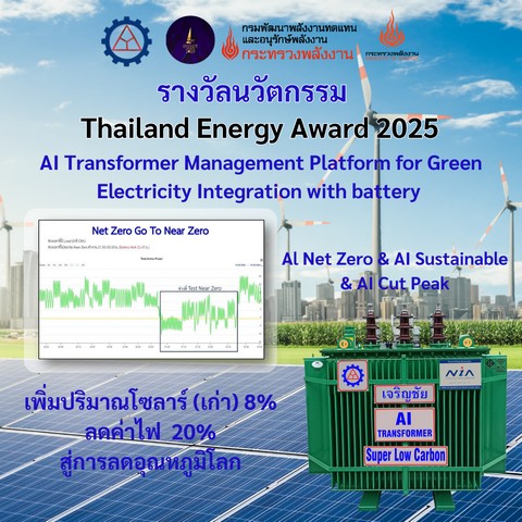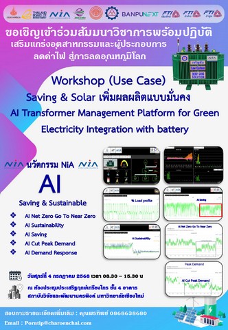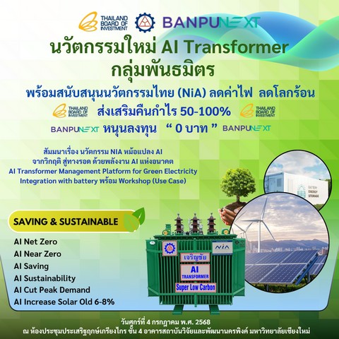 “เจริญชัย – ERDI-CMU – KMUTT” นำนวัตกรรม NIA หม้อแปลง AI Low Carbon ลดโลกร้อนลดค่าไฟจริง 20% เพิ่มปริมาณกำลังการผลิตโซลาร์ 6-8% คืนทุน 1 ปี กลุ่มพันธมิตรพร้อมสนับสนุนการลุงทุน 0 บาท และคืนกำไร 100% AI Transformer Management Platform for Green Electricity Integration with battery พร้อม Workshop (Use Case)